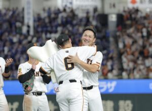 マー君こと田中将大投手がやっと日米通算200勝達成、おめでとうございます。坂本勇人選手からの花束贈呈とハグは絵になりました。(写真はスポーツ報知より)